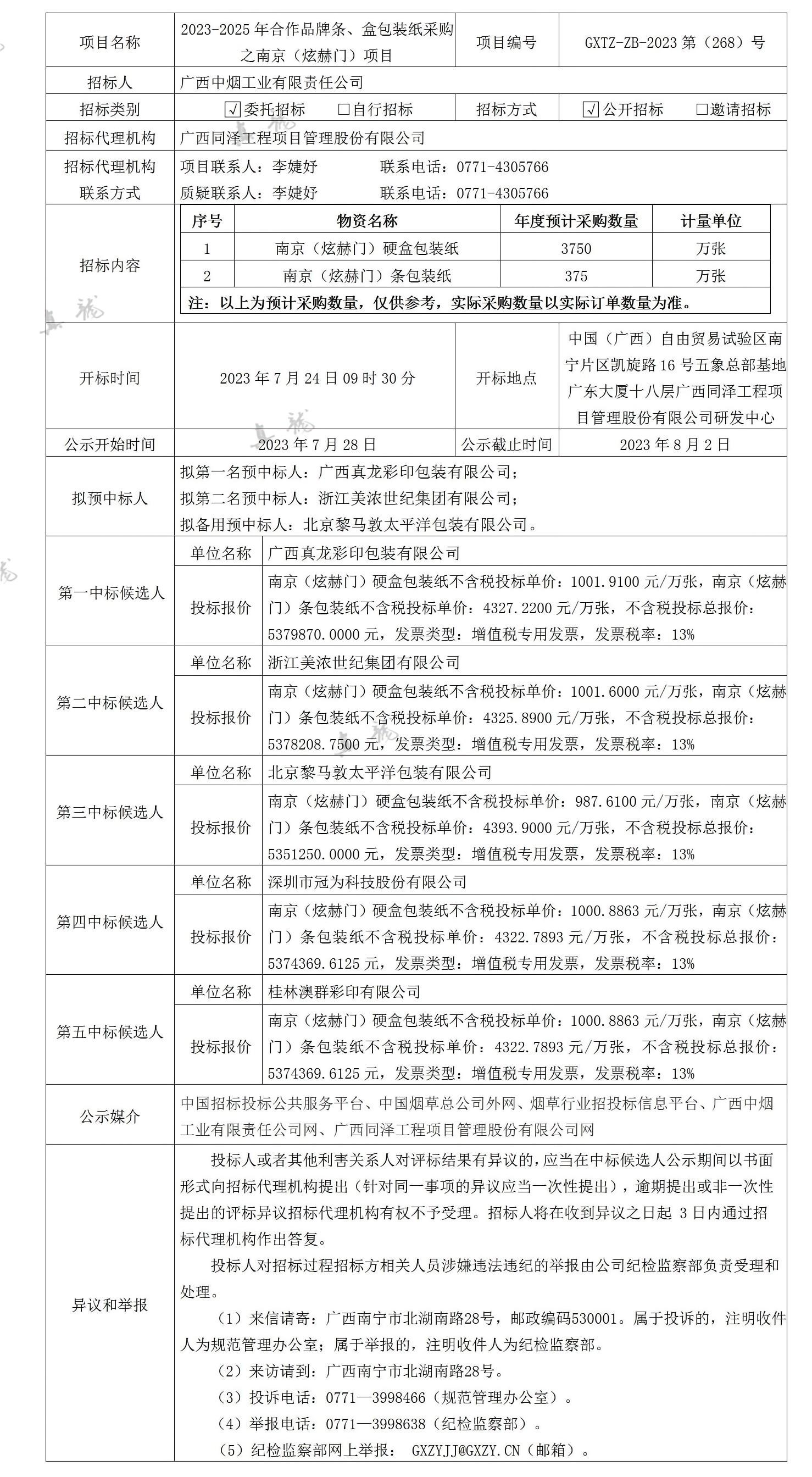 廣西中煙工業(yè)有限責(zé)任公司2023-2025年合作品牌條、盒包裝紙采購(gòu)之南京(炫赫門)項(xiàng)目(項(xiàng)目編號(hào):GXTZ-ZB-2023第(268)號(hào))中標(biāo)候選人公示