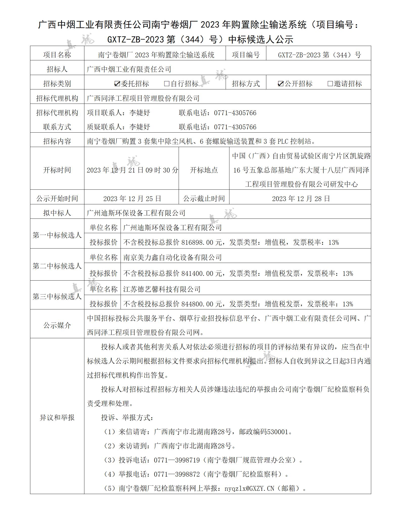 廣西中煙工業(yè)有限責(zé)任公司南寧卷煙廠2023年購(gòu)置除塵輸送系統(tǒng)(項(xiàng)目編號(hào):GXTZ-ZB-2023第(344)號(hào))中標(biāo)候選人公示