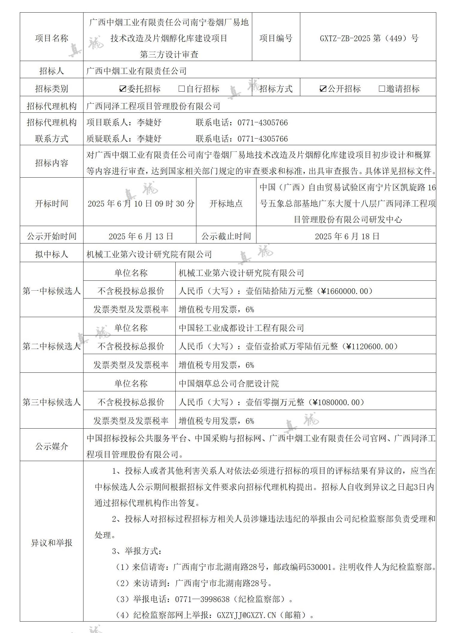 廣西中煙工業(yè)有限責(zé)任公司南寧卷煙廠易地技術(shù)改造及片煙醇化庫建設(shè)項目第三方設(shè)計審查(項目編號:GXTZ-ZB-2025第(449)號)中標(biāo)候選人公示