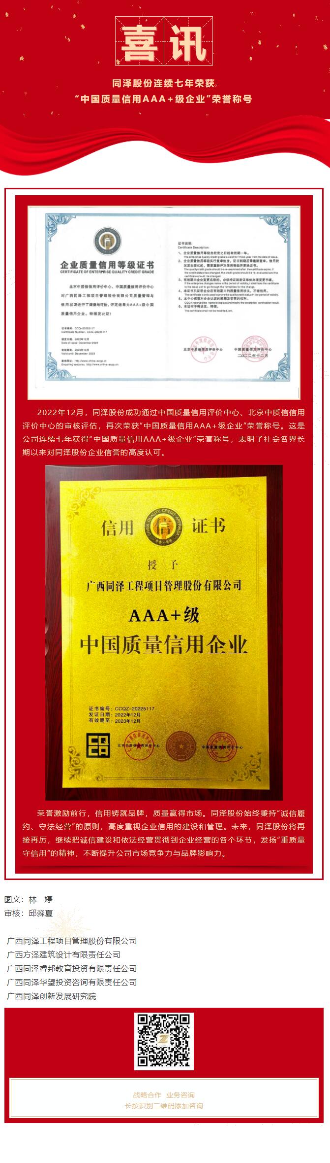 喜訊 | 同澤股份連續(xù)七年榮獲“中國質量信用AAA+級企業(yè)”榮譽稱號